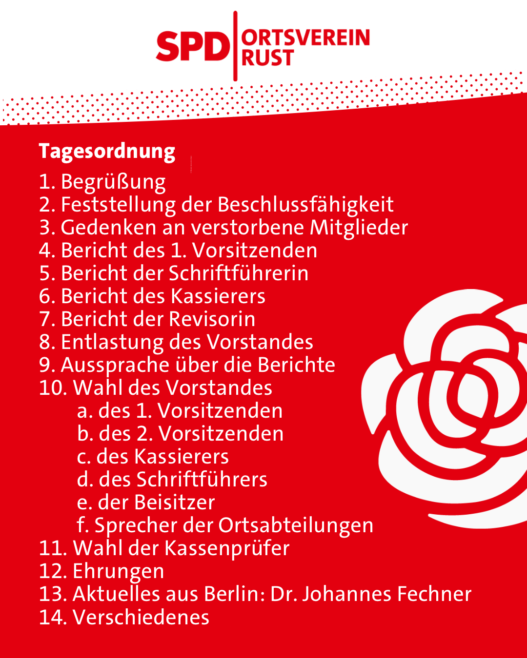 Der SPD Ortsverein Rust lädt am Dienstag, 29. April 2025 um 19 Uhr im Restaurant Mythos, Hausener Str. 1 zur diesjährigen Jahreshauptversammlung ein.