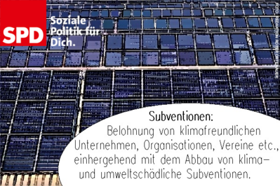 Belohnung von klimafreundlichen Unternehmen, Organisationen, Vereine etc., einhergehend mit dem Abbau von klima- und umweltschädlichen Subventionen.
