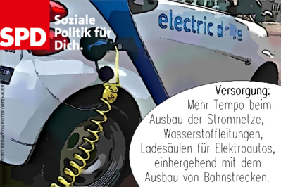 Mehr Tempo beim Ausbau der Stromnetze, Wasserstoffleitungen, Ladesäulen für Elektoautos, einhergehend mit dem Ausbau von Bahnstrecken.